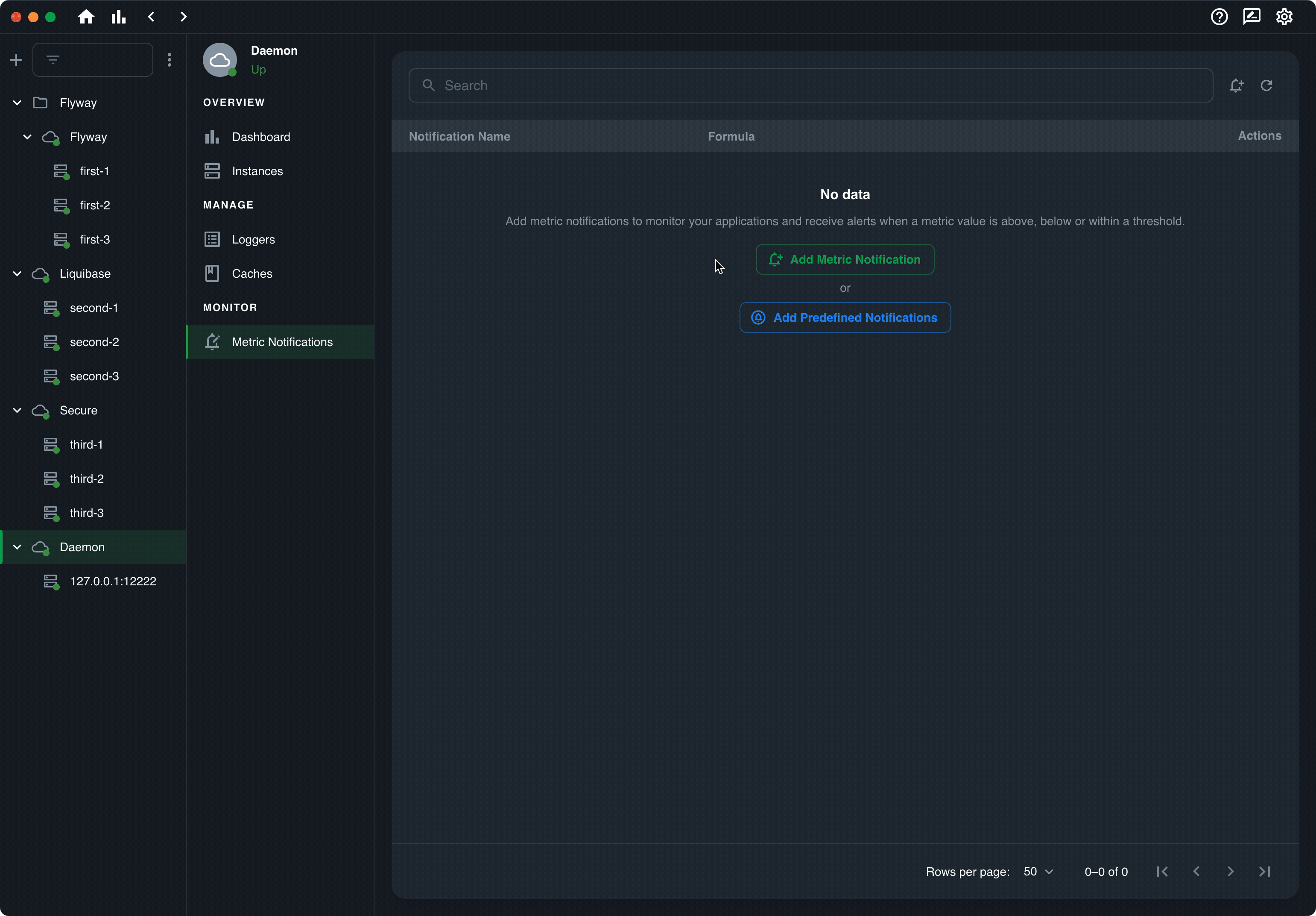 In the Metric Notifications screen you can set rules regarding metrics in your Application, for which to receive notifications. Ostara periodically updates the Metrics from Actuator, and applies the rules defined. In the event a rule evaluation (by any instance) is TRUE a notification  will be triggered.